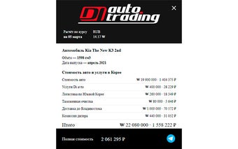 D'I auto Korea to darmowe rozszerzenie Chrome, zaprojektowane w celu pomocy użytkownikom w obliczaniu całkowitego kosztu zakupu pojazdu z Korei Południowej za pośrednictwem strony encar.com. To narzędzie zapewnia szczegółowy podział wydatków, w tym podstawową cenę samochodu przeliczoną na ruble na podstawie aktualnego kursu dolara. Uwzględnia również dodatkowe koszty, takie jak opłaty serwisowe od D'I auto, prowizje dealerów oraz koszty wysyłki do Rosji.